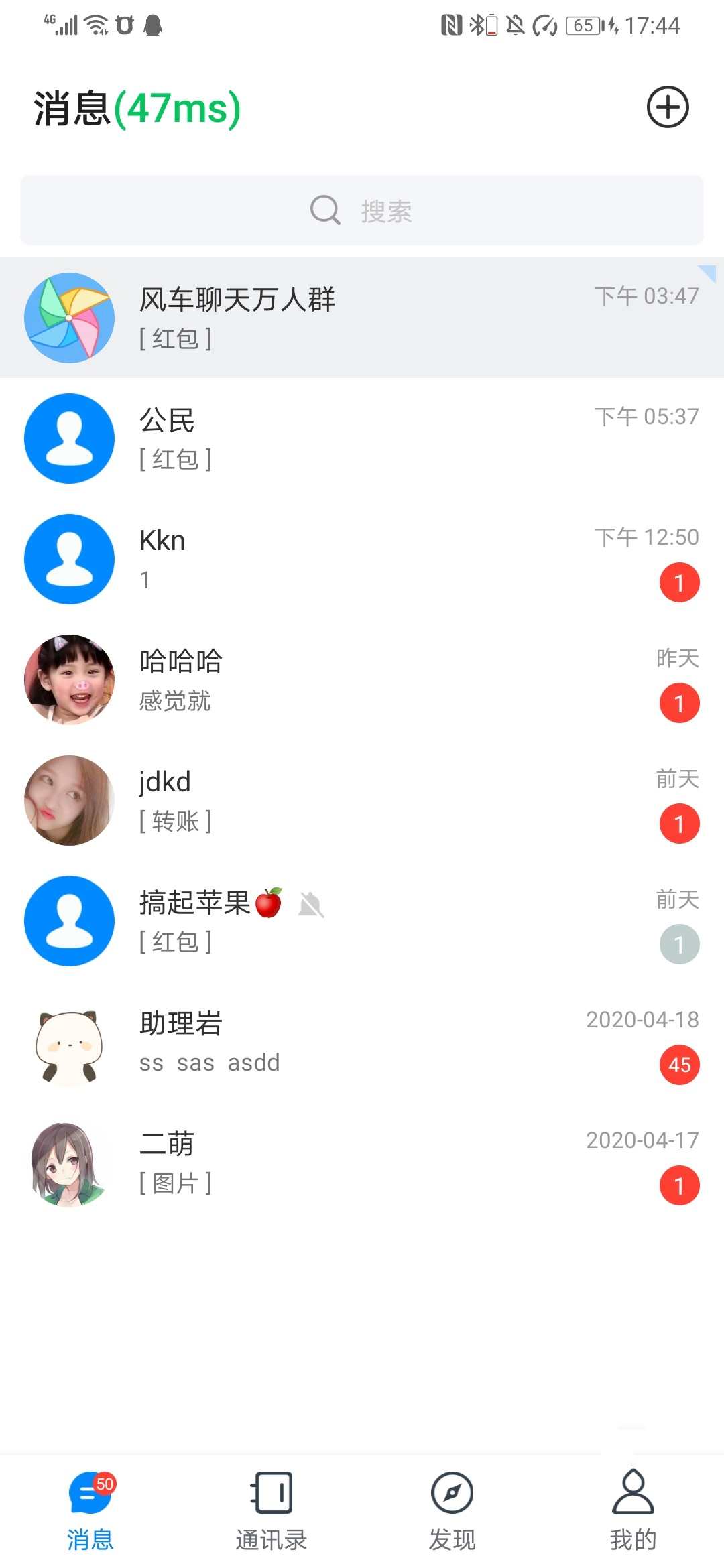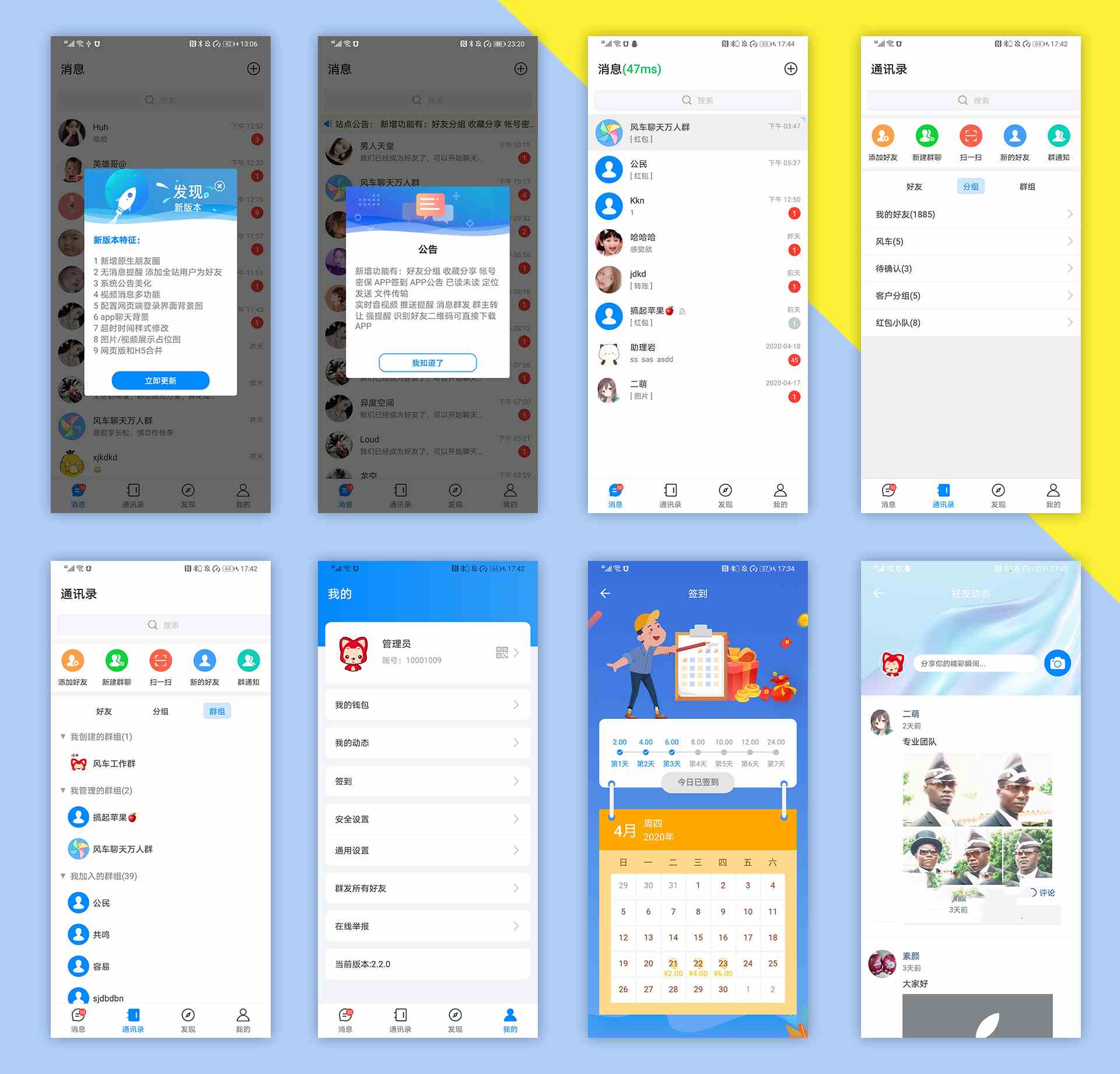 支持文字、表情、图片、语音、单聊、群聊、已读未读、发现、红包等完备的IM功能。