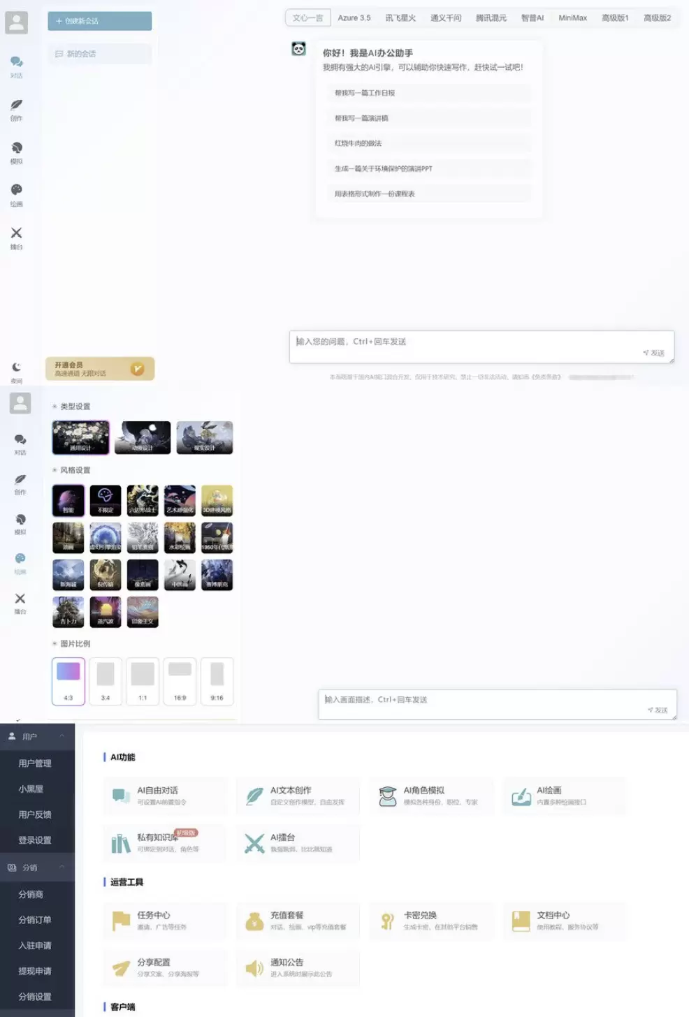 1、已对接国内百度文心、讯飞星火、Azure GPT、通义千问、腾讯混元、智普AI、Claude2等主流AI系统,还可以自建模型对接,目前是功能最全的一款AI。