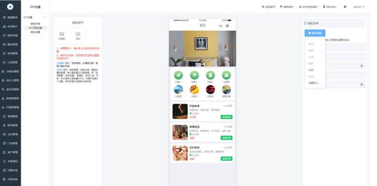 16、DIY设置( DIY页面设置,用户可以自由排版,任选链接页面或加减底部菜单 )