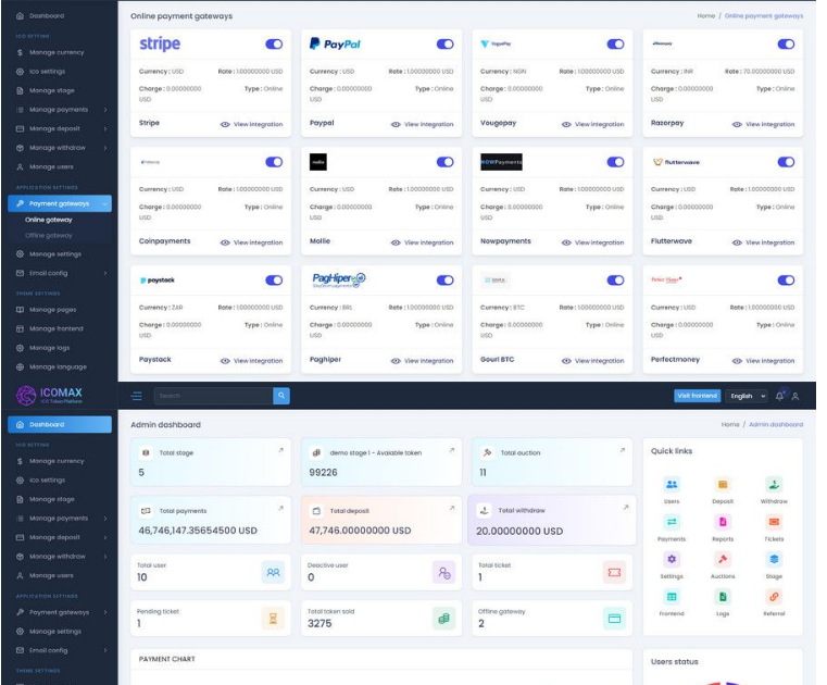 | 区块链虚拟币代币销售拍卖平台,加密货币全方位数字资产交易平台。是一款功能强大的数字资产交易平台,为用户提供了安全、高效的交易环境。该平台基于最新的 Laravel 8.x 框架开发,具有易于安装、多语言支持、在线/离线支付网关、KYC、电子邮件和短信验证等特色功能。此外,ICOMAX 还支持多种支付网关,包括 Razorpay、Coinpayment、Mollie Payment、NowPayments、PayStack、Flutterwave 等。用户可以使用法定货币和多种加密货币进行阶段性销售,并享受拍卖和聊天等功能。无论是个人用户还是企业机构,ICOMAX 都能满足其数字资产交易的需求。