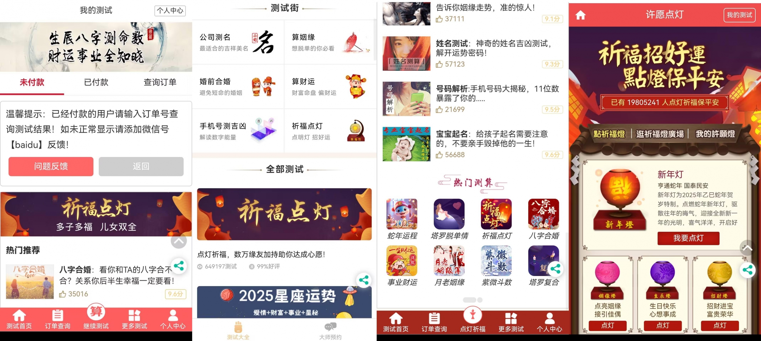 八字精批、事业财运、姓名分析、宝宝起名、姓名配对、综合详批、姻缘测算、八字合婚、紫微斗数、龙年运程、月老姻缘、号码解析、塔罗运势、塔罗爱情等。